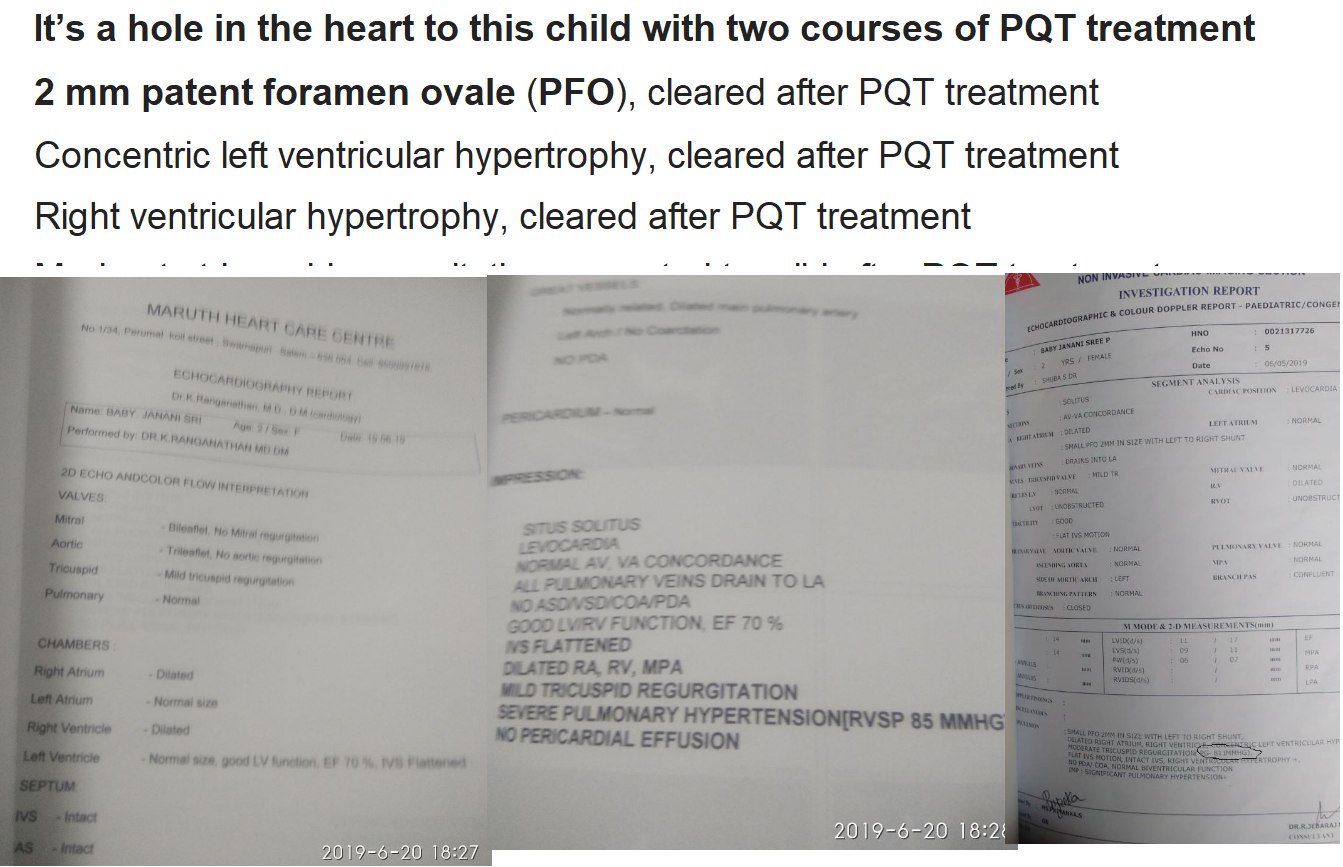 “It’s a hole in the heart to this child with two courses of PQT treatment 2 mm patent foramen ovale (PFO), cleared after PQT treatment Concentric left ventricular hypertrophy, cleared after PQT treatment Right ventricular hypertrophy, cleared after PQT treatment Moderate tricuspid regurgitation corrected to mild after PQT treatment”